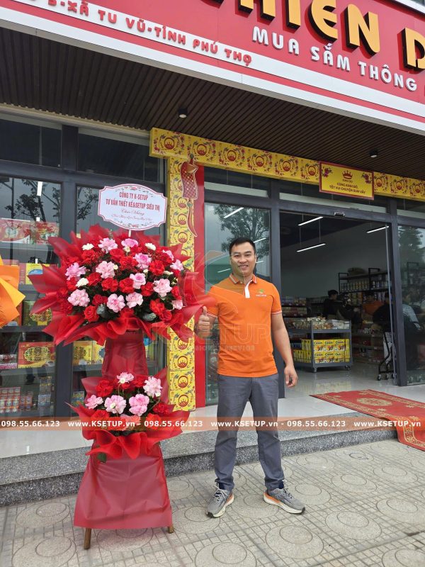 Nhân dịp siêu thị chính thức khai trương, K-SETUP trân trọng gửi tặng lẵng hoa tươi thắm tới Quý Chủ đầu tư như một lời chúc tốt đẹp, đồng thời bày tỏ lòng tri ân sâu sắc trước sự tin tưởng lựa chọn dịch vụ thiết kế – mở siêu thị của chúng tôi.
