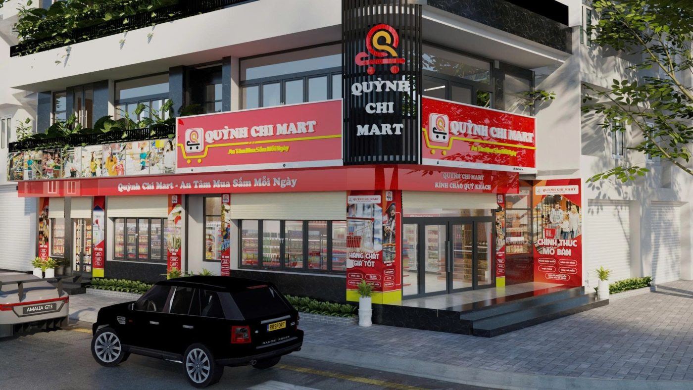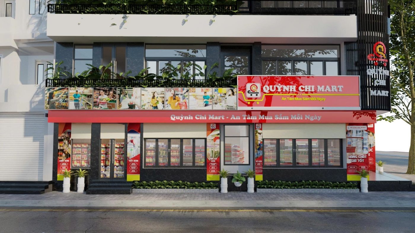 Thiết kế mặt tiền Quỳnh Chi Mart nổi bật với màu đỏ chủ đạo, tạo cảm giác năng động, thu hút và dễ nhận diện từ xa. Giải pháp thiết kế 3D siêu thị giúp thể hiện rõ tổng thể mặt đứng, bố cục biển bảng hài hòa và đồng bộ. Các chi tiết được sắp xếp khoa học, phù hợp với phong cách xây dựng mặt bằng hiện trạng. Tổng thể thiết kế mang tính khác biệt, đổi mới, góp phần nâng cao hình ảnh thương hiệu và hiệu quả kinh doanh.