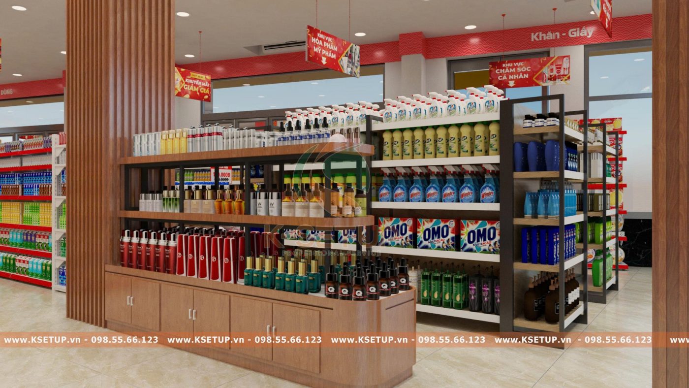 Phía trong siêu thị Quỳnh Chi Mart, K-Setup đã thiết kế một cách đầy đủ và tinh tế cho từng khu vực hàng hóa. Khu vực giá kệ tiêu chuẩn được thiết kế riêng cho các mặt hàng tiêu dùng hàng ngày như hóa mỹ phẩm (dầu gội, xà phòng, sữa tắm,…), thực phẩm khô, gia vị, bia nước sữa,… Thiết kế được đội ngũ chuyên gia thiết kế K-Setup nghiên cứu chi tiết nhằm đảm bảo số lượng giá kệ phù hợp, đồng thời duy trì sự đa dạng ngành hàng phục vụ khách mua sắm.