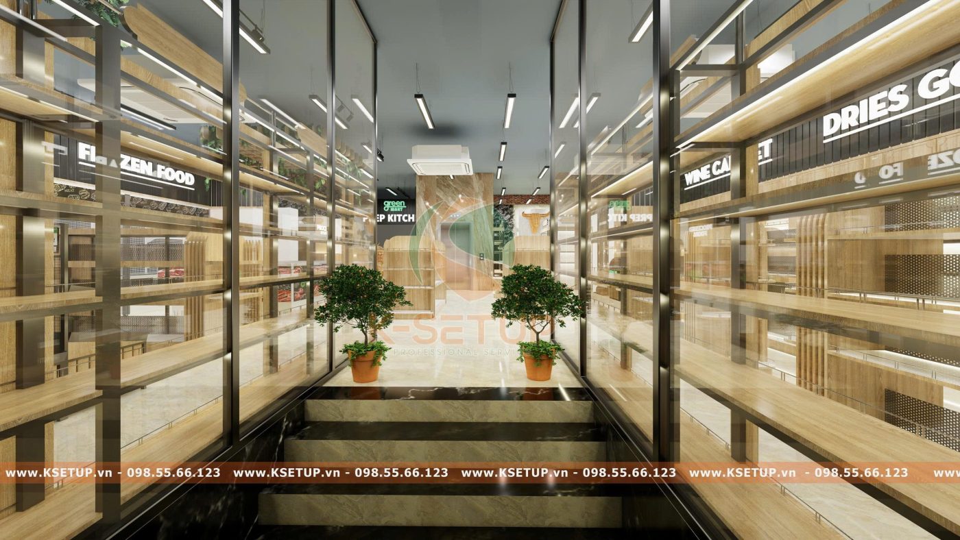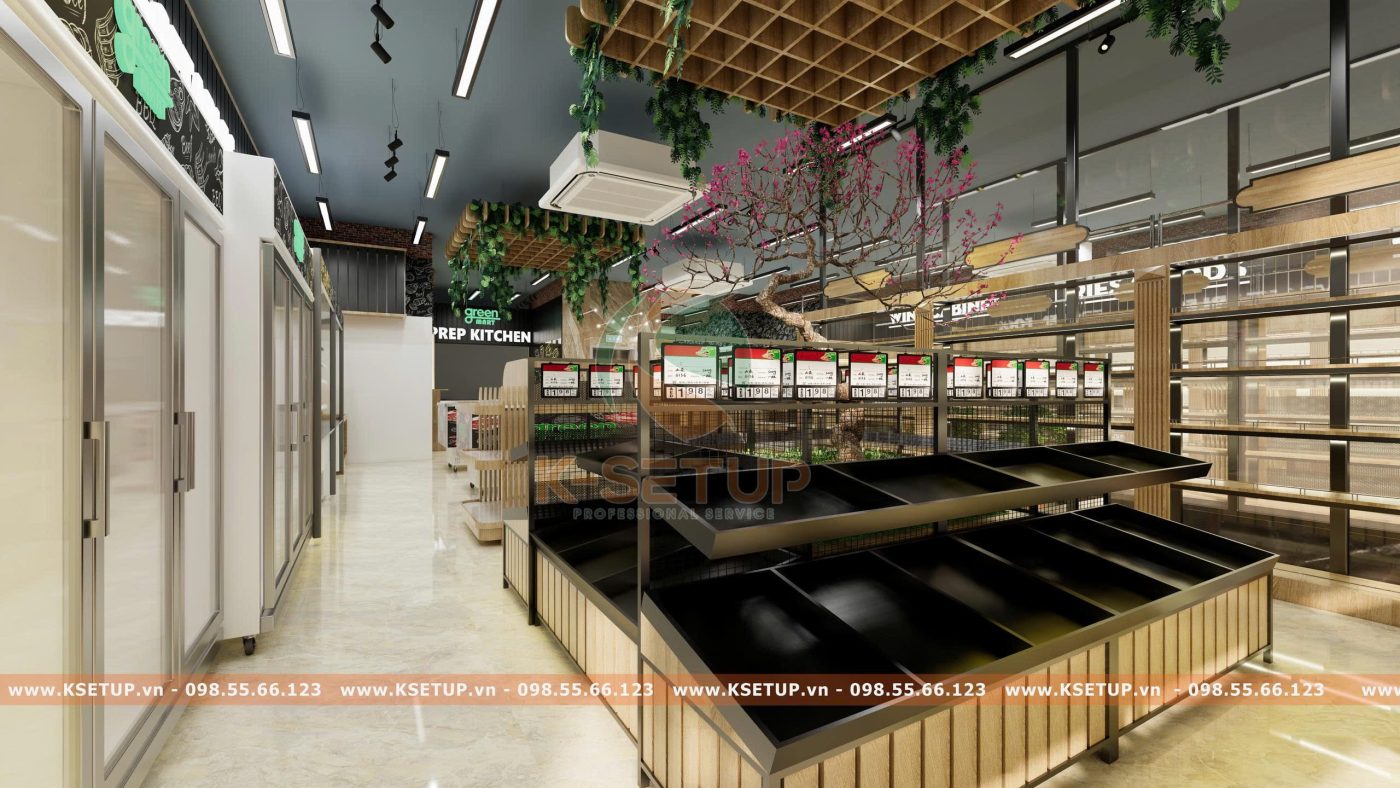 Quan trọng hơn hết, K-SETUP luôn nắm rõ và áp dụng chính xác các quy tắc phân khu trong thiết kế siêu thị, đặc biệt là việc tách biệt rõ ràng giữa khu thực phẩm tươi sống và khu thực phẩm khô, thực phẩm chín. Cách bố trí này giúp hạn chế tối đa nguy cơ lây nhiễm chéo giữa các loại thực phẩm, đảm bảo tiêu chuẩn vệ sinh an toàn thực phẩm trong quá trình trưng bày và bảo quản. Đồng thời, phương án phân khu khoa học cũng góp phần nâng cao chất lượng vận hành cho mô hình siêu thị kết hợp thực phẩm sạch, mang lại sự yên tâm cho khách hàng khi mua sắm.