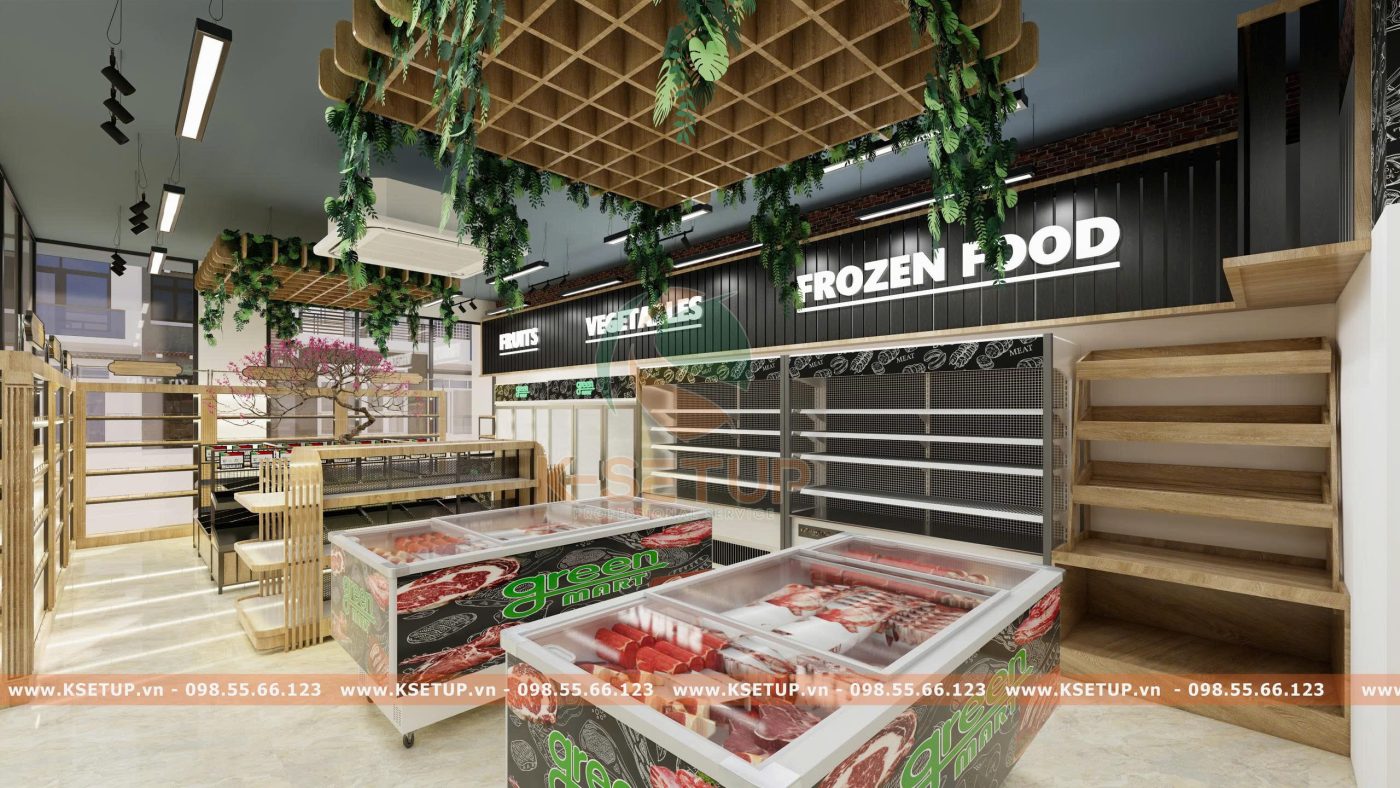 Đội ngũ chuyên gia thiết kế K-Setup đã tiến hành tính toán kỹ lưỡng khu vực bố trí hệ thống tủ đông, tủ mát ngay từ giai đoạn khảo sát mặt bằng thực tế. Nhờ đó, phương án sắp xếp được đưa ra không chỉ tối ưu công năng trưng bày các sản phẩm thực phẩm sạch và thực phẩm đông lạnh, mà còn giúp luồng di chuyển trong siêu thị trở nên khoa học hơn. Đồng thời, cách bố trí hợp lý này cũng góp phần tối ưu điện năng vận hành, giúp siêu thị tiết kiệm chi phí lâu dài nhưng vẫn đảm bảo hiệu quả bảo quản sản phẩm.